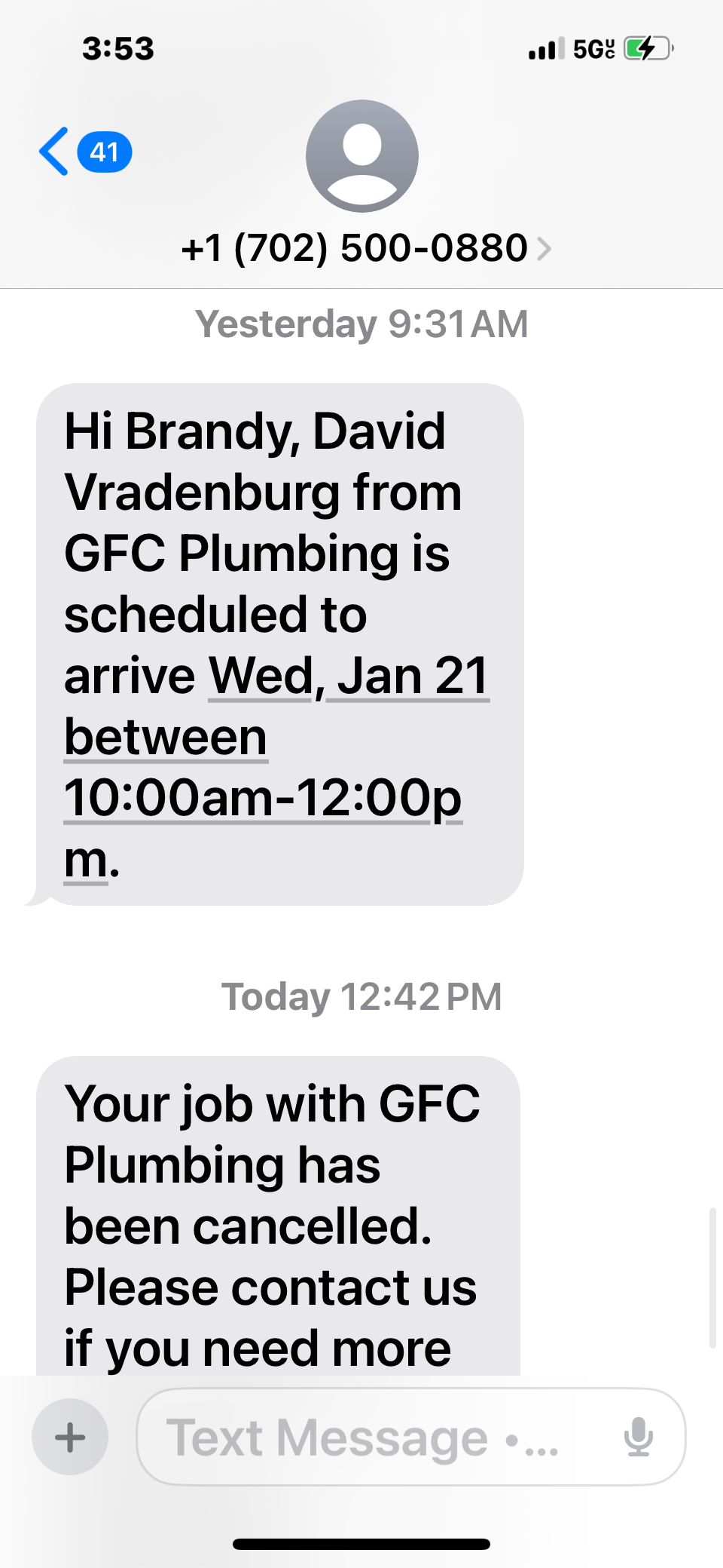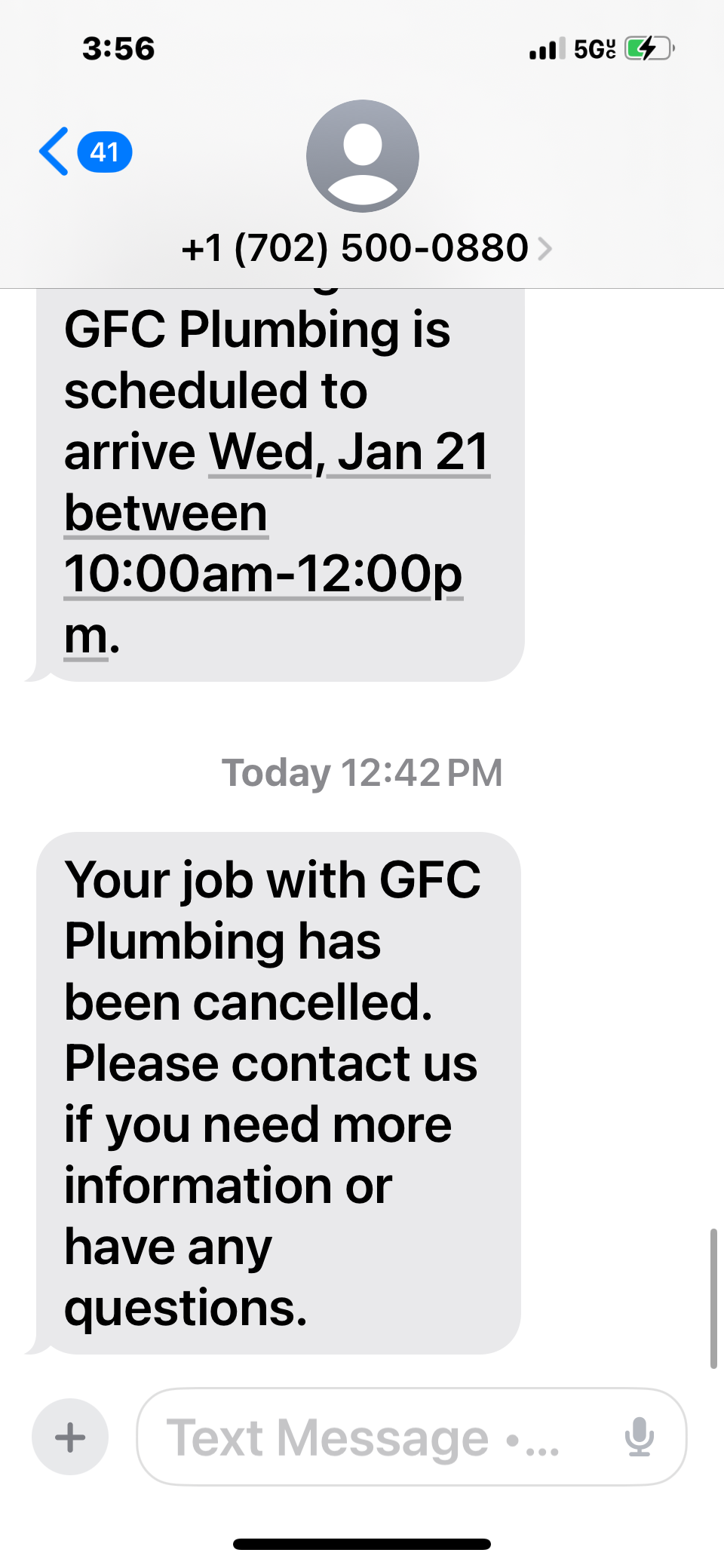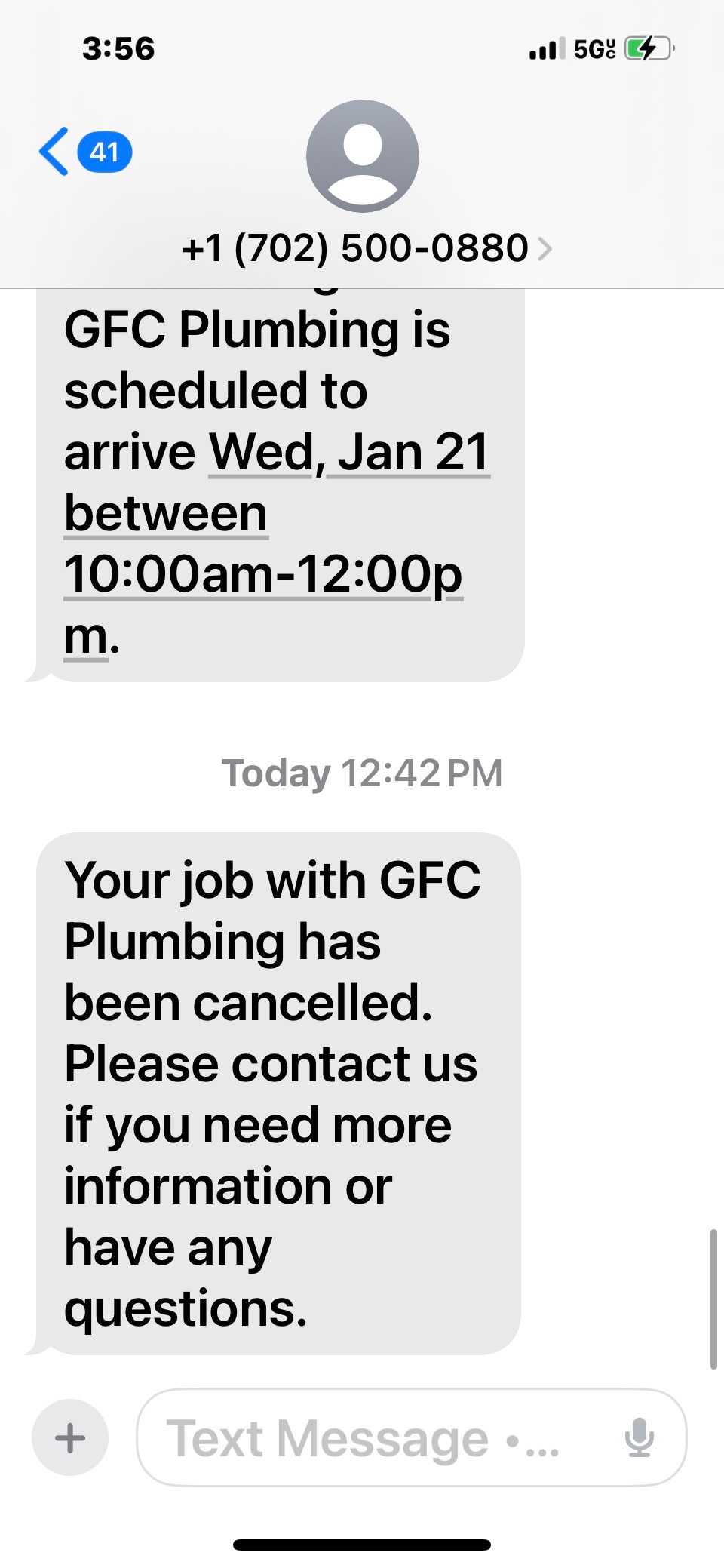 Did you not see the texts o sent you above??? They sent the first one saying they were coming tomorrow and then one today cancelling so as far as I am concerned their appointment was cancelled by them the plumbing company today. They have not reached out to me at all since cancelling.
