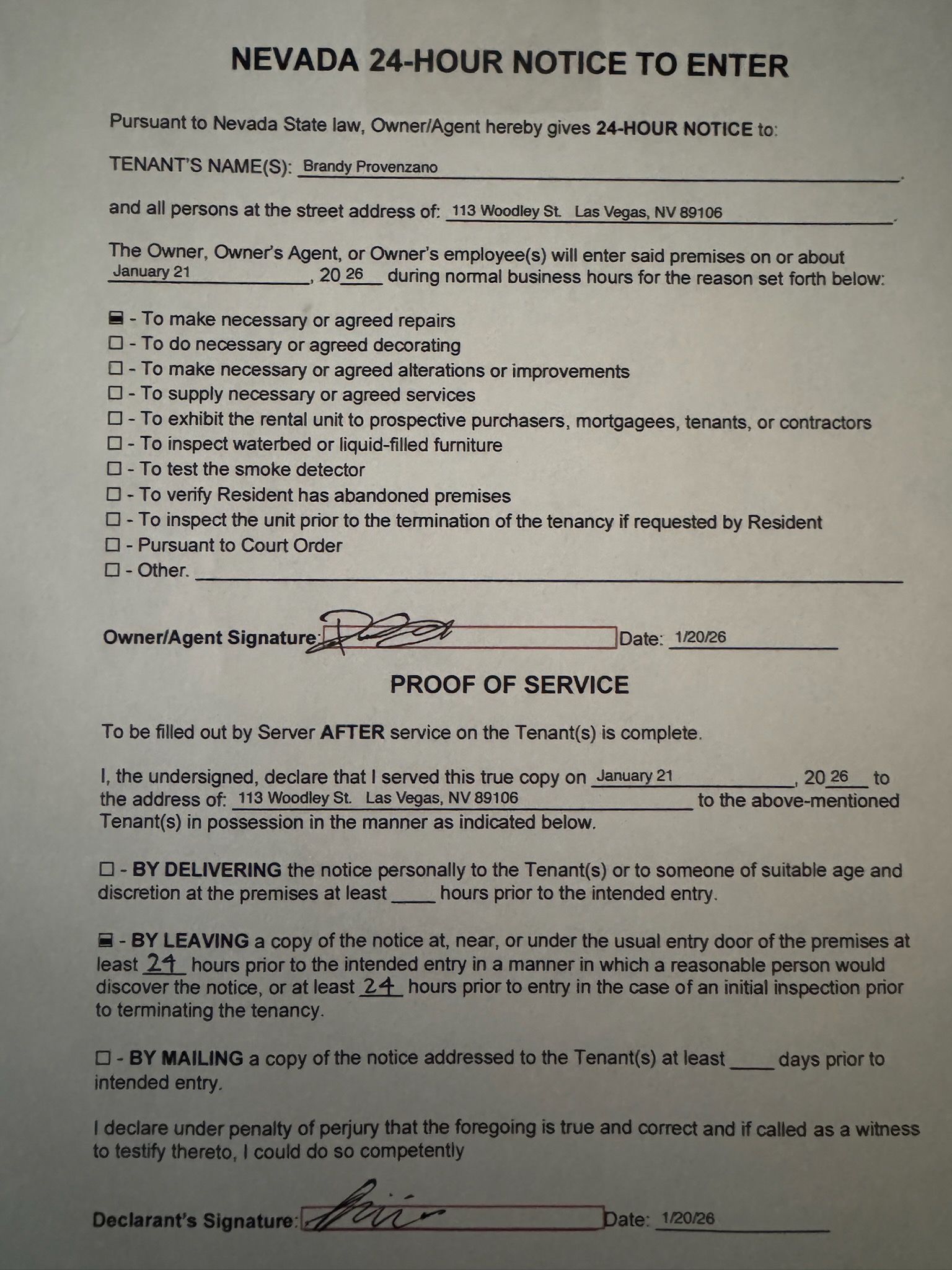 Brandy, As previously noted, access is required to complete the repairs. A 24-hour notice was properly posted today in compliance with notice requirements. The plumbing company contacted you directly regarding a tentative appointment, which was later adjusted pending confirmation of access. Please ensure access is provided during the noticed window so the necessary repairs can be completed. Thank you.