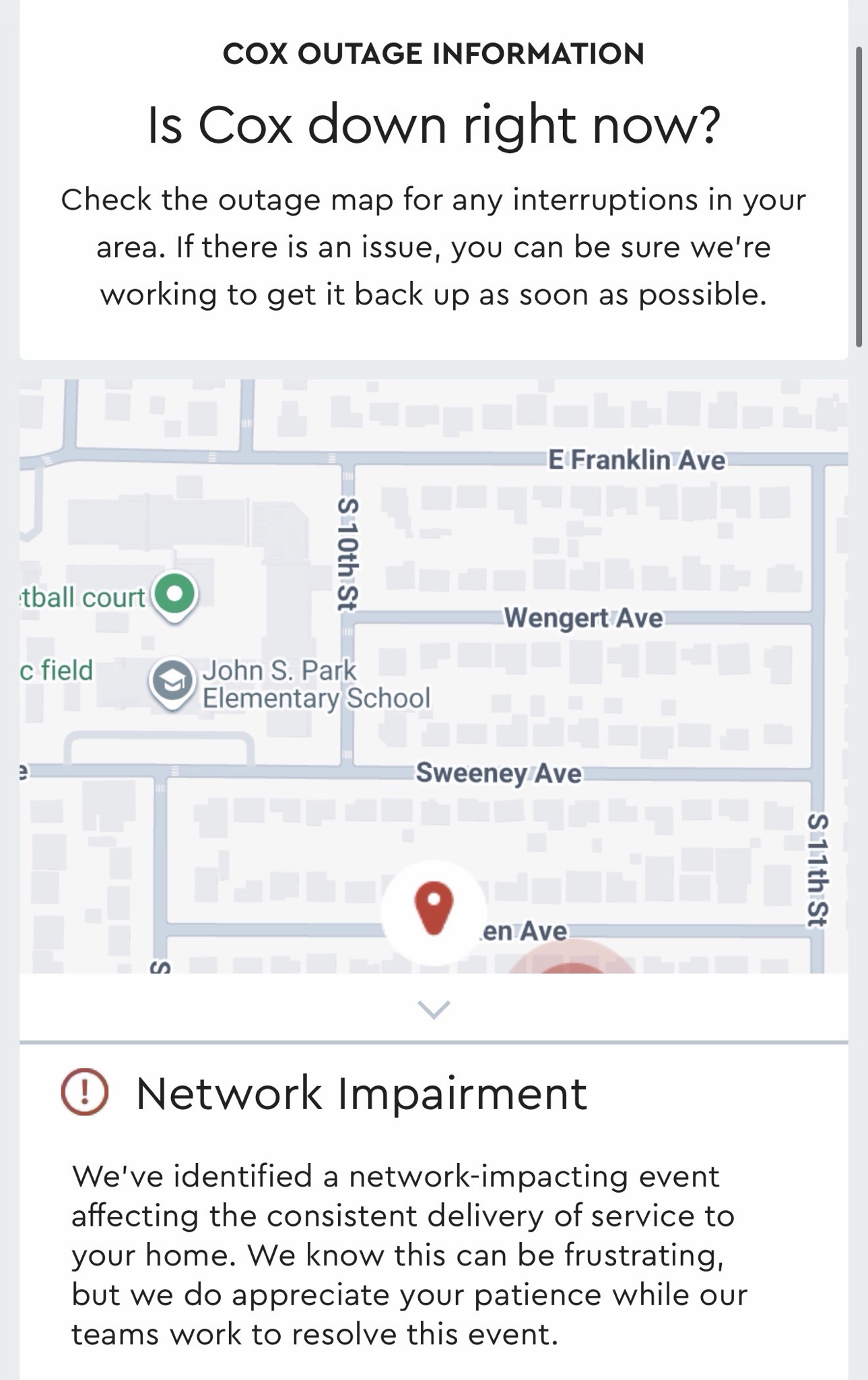 I know this is not your fault, I don't have anyone else to ask. The internet has been down for over 18 hrs, that I know of...I used the link you sent and it tells me there may be an outage. It then wants a login and password, which I don't have. I called cox and the agent told me the same. Im sorry to bother you , but are there any updates on service restoration?
